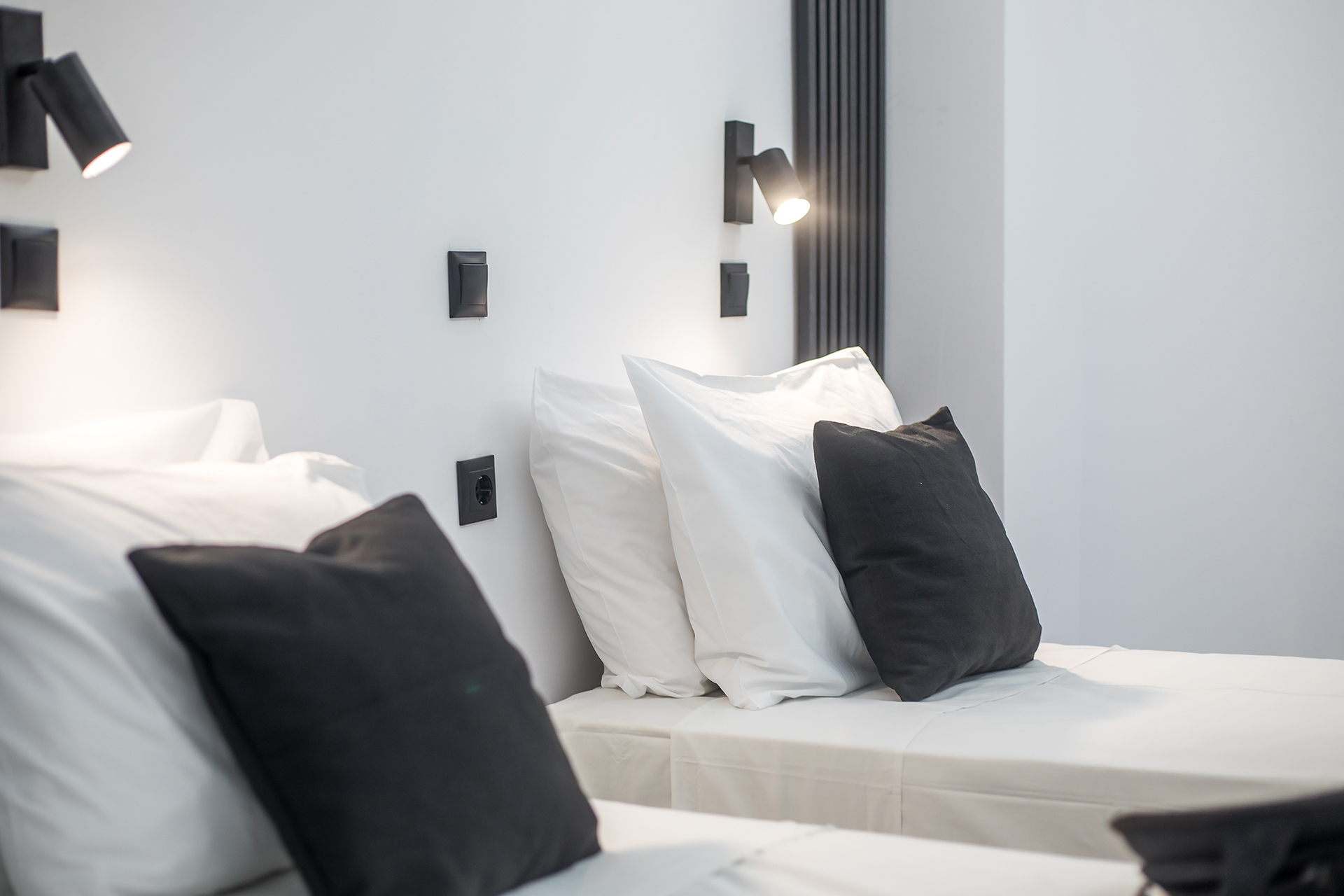 The Large Twin rooms with no balcony at Vicky’s Faliraki offer a carefully considered option for those seeking a comfortable and quiet stay in a modern and functional environment. With an area of 28 sqm, they are ideal for two guests and provide a well-equipped space designed for relaxation and rest.